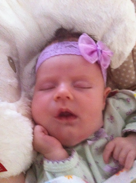 Our precious Seiden Grace is already ONE MONTH old! My, my does the time fly! It is really hard to believe that this precious angel and perfect gift from God is already one month old. I feel like we're going to blink and she's going to be starting kindergarten. Gosh...I don't even want to think about that! She has already changed and grown so much in this past month. She is so much more alert and is staying awake longer in between feedings. She's always recognized us...but she is really starting to focus more and more on our faces and responds more to our voices. She can also see things from a bit further away. And...she loves to look at the lights and the fan...even when the fan's not on! We haven't gotten a smile out of her yet...but we think that's coming pretty quick! We get little half smiles...we think...but not a full blown grin yet. We can't wait for the day when that happens! She absolutely loves the dogs and the absolutely love her. The older she's gotten, the more she reacts to them too. Faith and Trigger love to sniff her head and give her sugars...and she just lays there and lets them or makes little coos at them...so precious! We are having so much fun with her...she is so amazing!!! I can't even imagine what all we have to look forward to as she progresses over the next few months!
